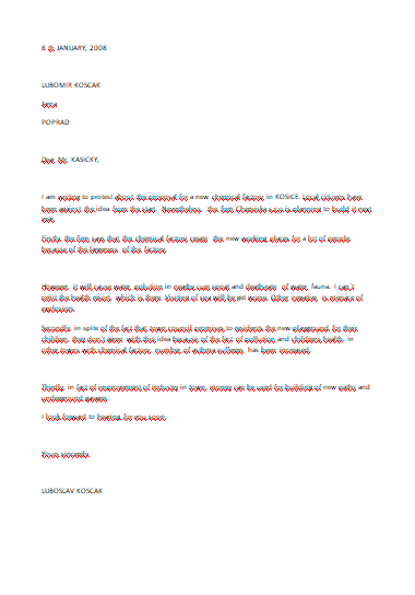 I am writing to protest about the proposal for a new chemical factory in KOSICE. Local citizens have been against the idea from the start. Nevertheless, the firm Chemiska s.r.o is planning to build it next year.
