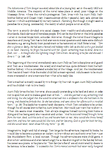 The Adventures of Tom Sawyer is a story about life of a young boy, set in the early 1800’s in Middle America. The majority of the novel takes place in small, poor village on the Mississipi River, where the novel’s protagonist, Tom, lives with his Aunt Polly, half-brother Sidney and Cousin Mary. It seems almost idyllic - peaceful, lazy, safe, almost like heaven - which is symbolised by its very name St. Petersburg. But though it might seem a paradise for a young, careless boy, the reality of adult people is not so idyllic.