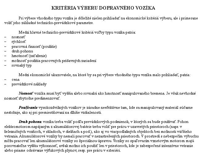 Medzi hlavné technicko-prevádzkové kritériá voľby typu vozíka patria: