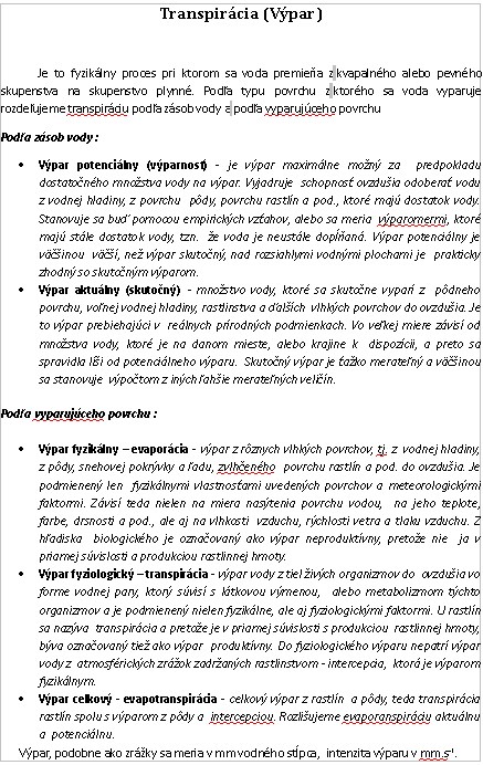 Je to fyzikálny proces pri ktorom sa voda premieňa z kvapalného alebo pevného skupenstva na skupenstvo plynné. Podľa typu povrchu z ktorého sa voda vyparuje rozdeľujeme transpiráciu podľa zásob vody a podľa vyparujúceho povrchu Podľa zásob vody : Výpar potenciálny (výparnosť) - je výpar maximálne možný za predpokladu dostatočného množstva vody na výpar. Vyjadruje schopnosť ovzdušia odoberať vodu z vodnej hladiny, z povrchu pôdy, povrchu rastlín a pod., ktoré majú dostatok vody. Stanovuje sa buď pomocou empirických vzťahov, alebo sa meria výparomermi, ktoré majú stále dostatok vody, tzn. že voda je neustále dopĺňaná. Výpar potenciálny je väčšinou väčší, než výpar skutočný, nad rozsiahlymi vodnými plochami je prakticky zhodný so skutočným výparom. Výpar aktuálny (skutočný) - množstvo vody, ktoré sa skutočne vyparí z pôdneho povrchu, voľnej vodnej hladiny, rastlinstva a ďalších vlhkých povrchov do ovzdušia. Je to výpar prebiehajúci v reálnych prírodných podmienkach. Vo veľkej miere závisí od množstva vody, ktoré je na danom mieste, alebo krajine k dispozícii, a preto sa spravidla líši od potenciálneho výparu. Skutočný výpar je ťažko merateľný a väčšinou sa stanovuje výpočtom z iných ľahšie merateľných veličín.