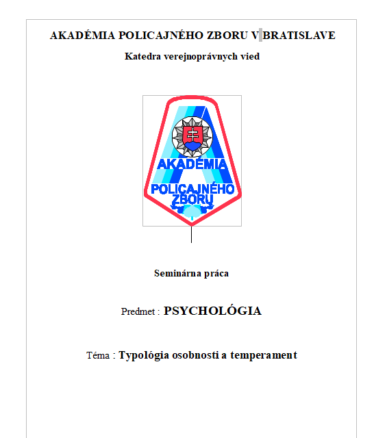 Seminárna práca sa venuje typológii osobnosti so zameraním na temperament ako relatívne stabilnú stránku prežívania a správania, ktorá sa premieta do dynamiky reakcií, psychického tempa, vytrvalosti, odolnosti voči záťaži aj do štýlu medziľudskej komunikácie. V historickej časti približuje antické korene temperamentu, najmä Hippokratovu teóriu štyroch telových štiav (krv, žlč, hlien a čierna žlč), ktorá sa stala východiskom pre tradičné rozlišovanie sangvinika, cholerika, flegmatika a melancholika. Nadväzuje pohľadmi neskoršej medicínskej tradície (Galenos) a uvádza modernejšie prístupy, napríklad Kretschmerovu konštitučnú teóriu, ktorá prepája telesnú stavbu s typickými temperamentnými prejavmi a naznačuje vzťahy medzi normou, hraničnými prejavmi a psychopatológiou.
