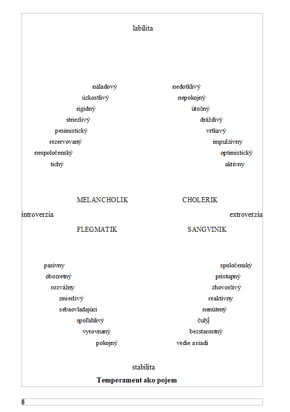 Významnú časť tvorí fyziologické vysvetlenie temperamentu cez nervové procesy vzruchu a útlmu (I. P. Pavlov) a ich vlastnosti - sila, vyrovnanosť a pohyblivosť - ktoré sa odrážajú v reaktivite, v schopnosti tlmiť impulzy a v adaptácii na meniace sa podmienky. Práca pracuje aj s rozlíšením introverzie a extraverzie (C. G. Jung) a predstavuje Eysenckovu dimenzionálnu koncepciu, kde sa temperament chápe ako kombinácia osí introverzia/extraverzia a stabilita/labilita. Tento rámec umožňuje vysvetliť typické „kvadranty“ správania (napr. vyššia labilita pri emotívnych reakciách, vyššia stabilita pri vyrovnanosti) a prepojiť ich s pozorovateľnými črtami.