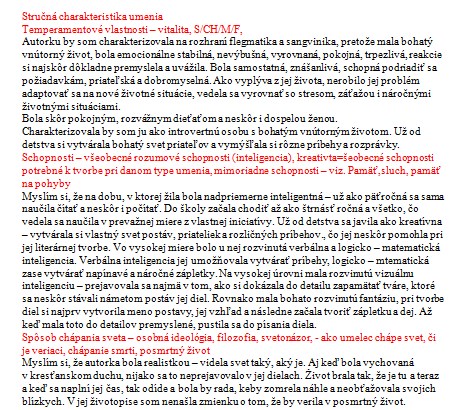 Autorku by som charakterizovala na rozhraní flegmatika a sangvinika, pretože mala bohatý vnútorný život, bola emocionálne stabilná, nevýbušná, vyrovnaná, pokojná, trpezlivá, reakcie si najskôr dôkladne premyslela a uvážila. Bola samostatná, znášanlivá, schopná podriadiť sa požiadavkám, priateľská a dobromyselná. Ako vyplýva z jej života, nerobilo jej problém adaptovať sa na nové životné situácie, vedela sa vyrovnať so stresom, záťažou i náročnými životnými situáciami.